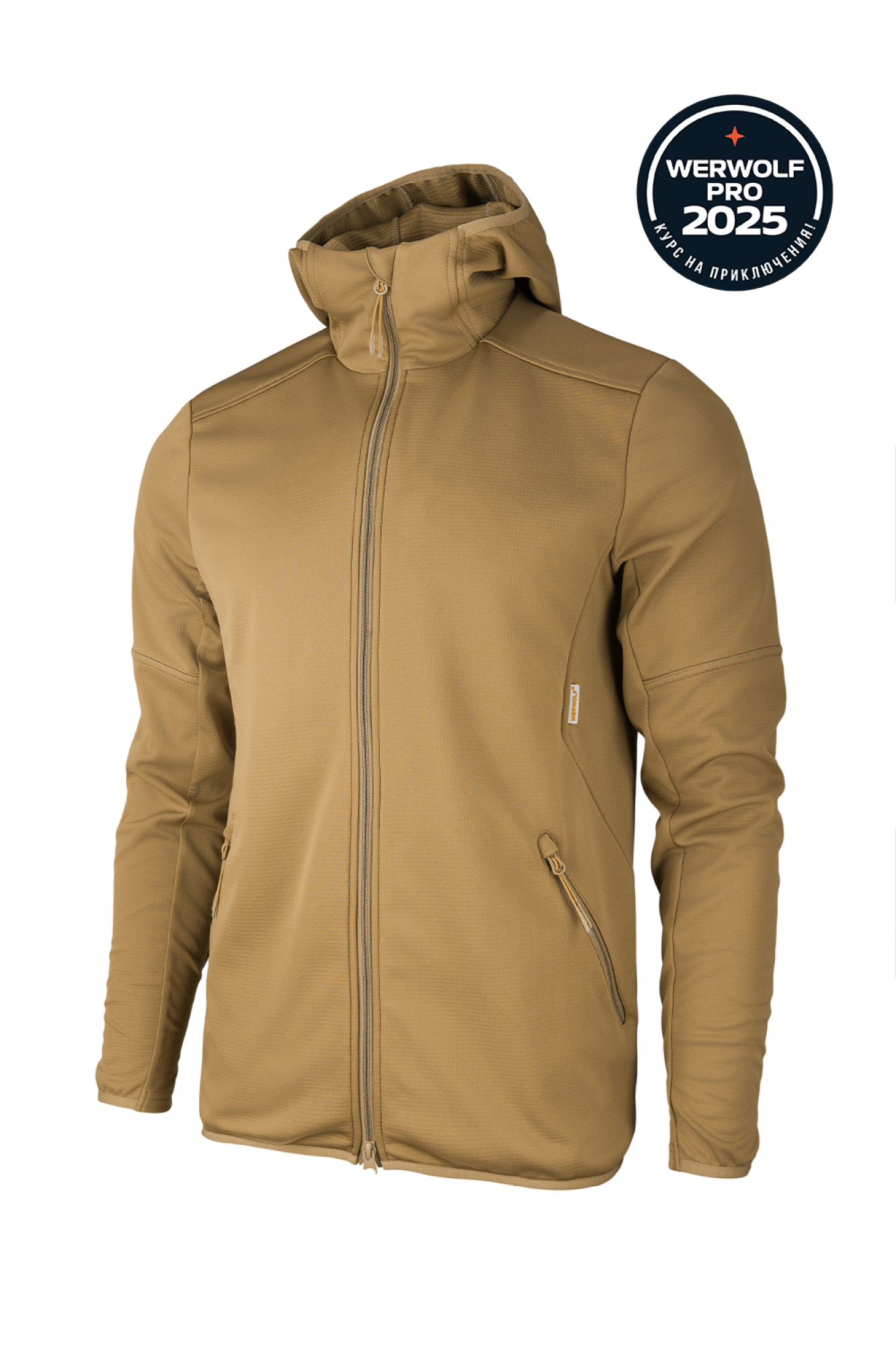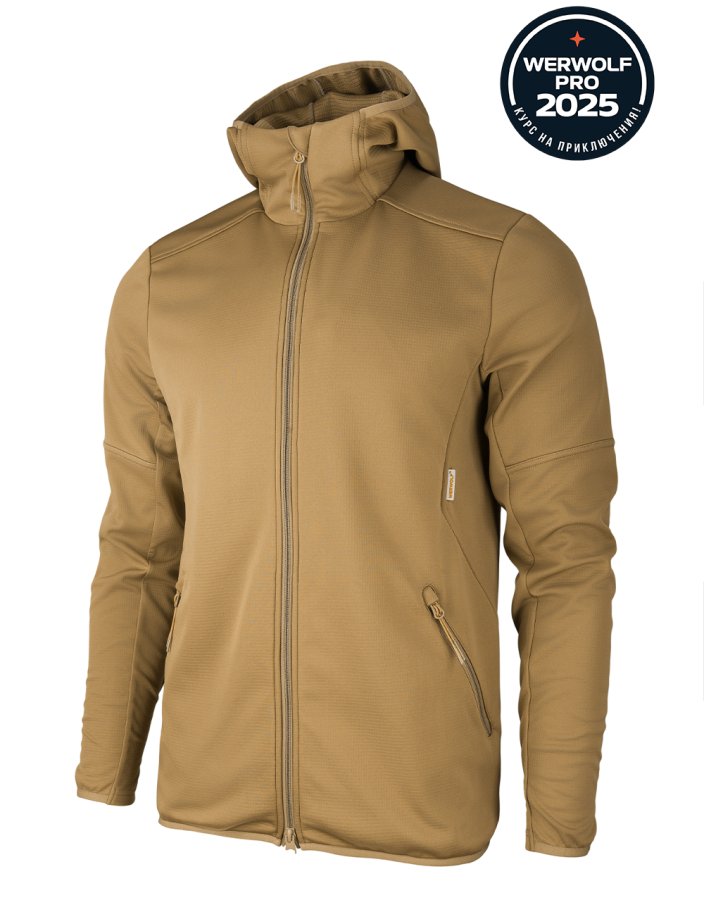 Толстовка, несмотря на плотное прилегание по фигуре, не стесняет движений благодаря сочетанию анатомического кроя и эластичного материала, а также применению технологии плоского шва. Капюшон с высокой стойкой создаёт дополнительную защиту от холода и может заменить головной убор.