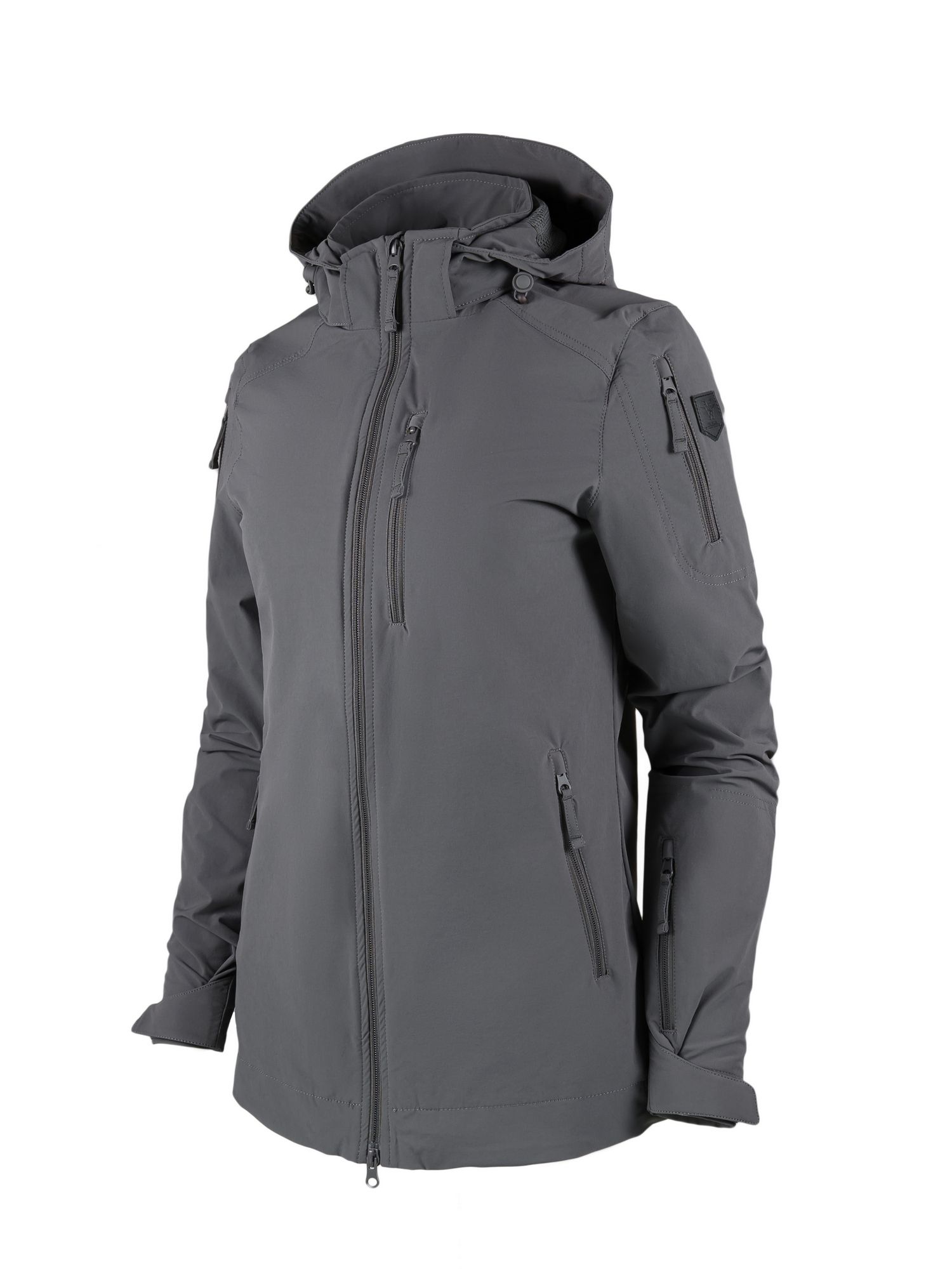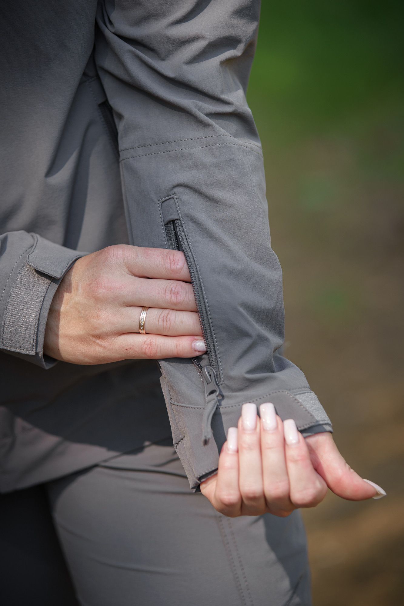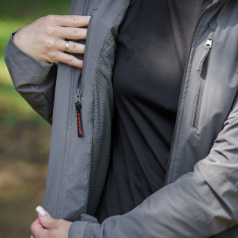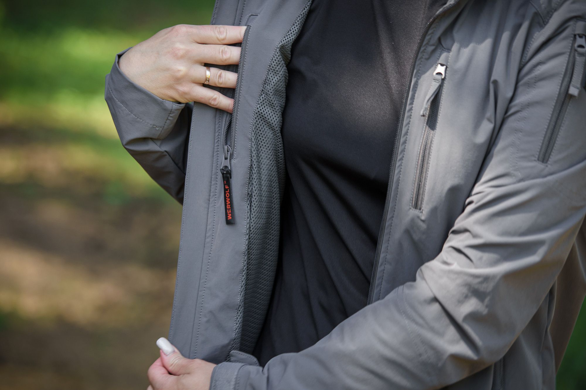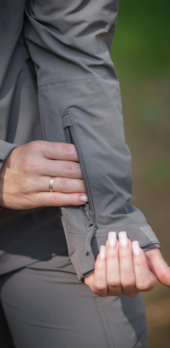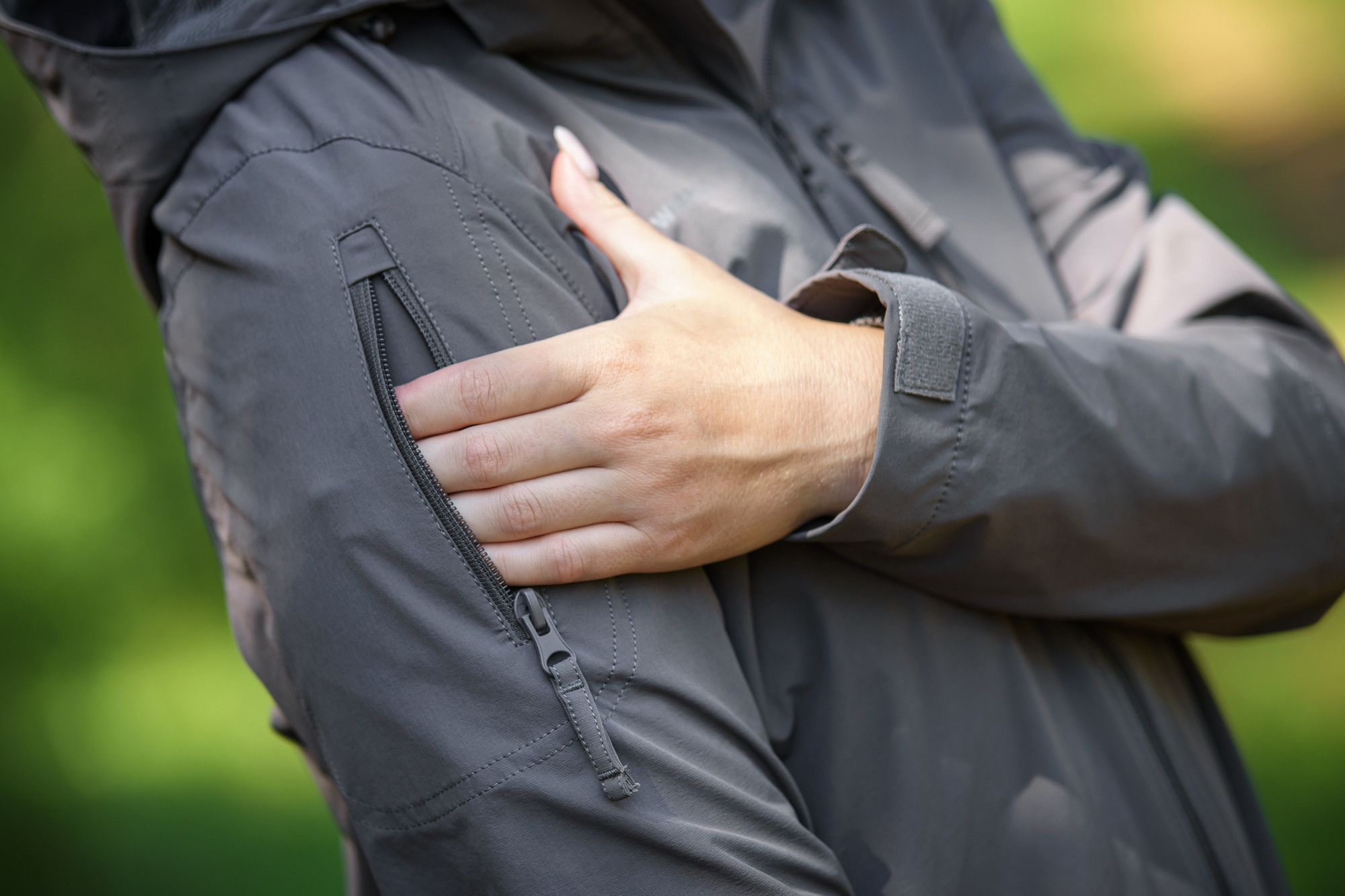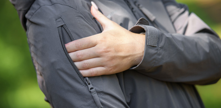 2 боковых, 2 на правом рукаве, 1 на левом,1 нагрудный, 1 внутренний - застёгиваются на тесьму молнию