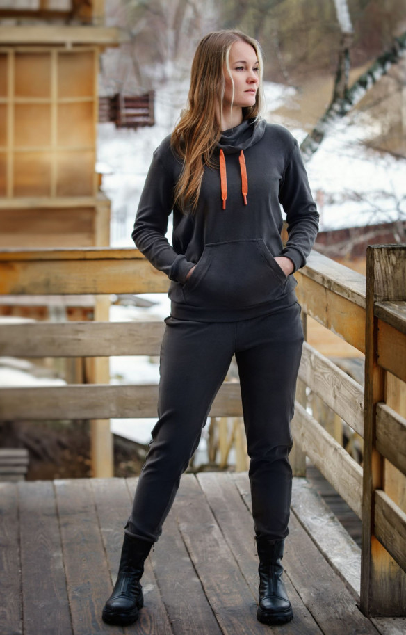 Спортивный костюм Energy Woman из трикотажа серого цвета — идеальный выбор для активных женщин, которые ценят комфорт и стиль. Костюм состоит из худи с глубоким капюшоном и брюк.